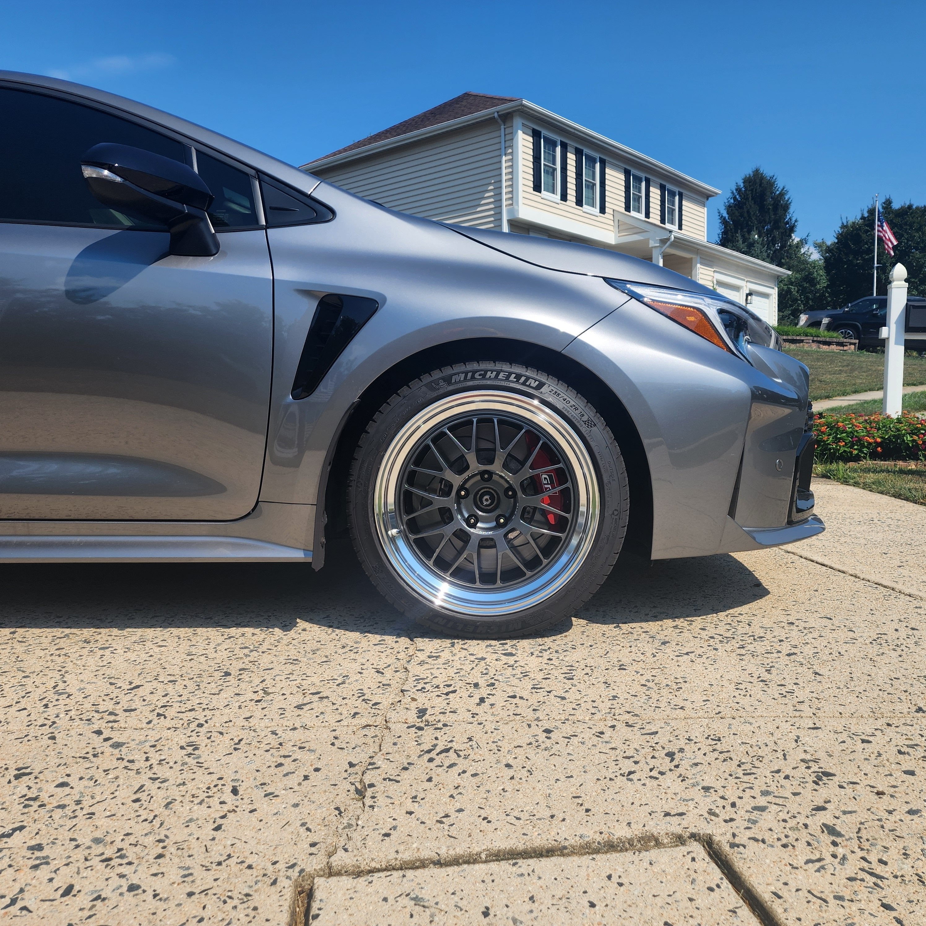 . ~6mm of caliper clearance to the spoke, 33mm to strut from inner rim. Unfortunately these are dual drilled wheels and the vendor does not tell you you need reduced size nuts to use the outer spacing of 5x114.3 holes. Fortunately I had some splined lugs on hand. 17mm hex lugs won't work, the bore is to small for a socket.